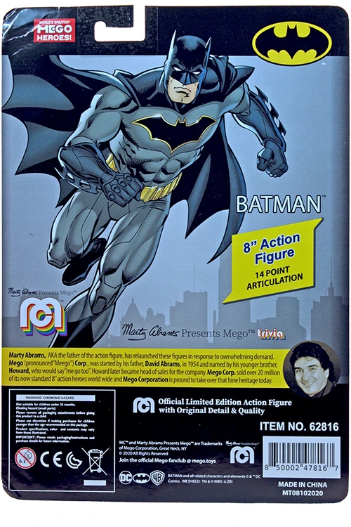 Mego Corporation re-launched in 2018 with a partnership between Marty Abrams and Joel Rosenzweig, focusing on 8-inch Action figures and launching with popular licenses from CBS, Warner Brothers, Sony, and Epic.