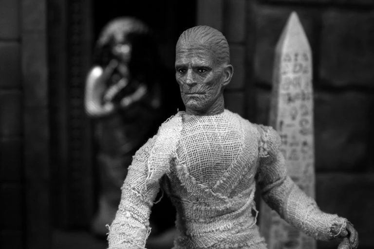 Traveling through the sands of the Megoverse The Mummy has returned with the new 8” classically styled Mego action figure! The Mummy is outfitted with screen accurate details and sculpting as seen in the 1932 film. Do you dare read the Scroll of Thoth aloud??