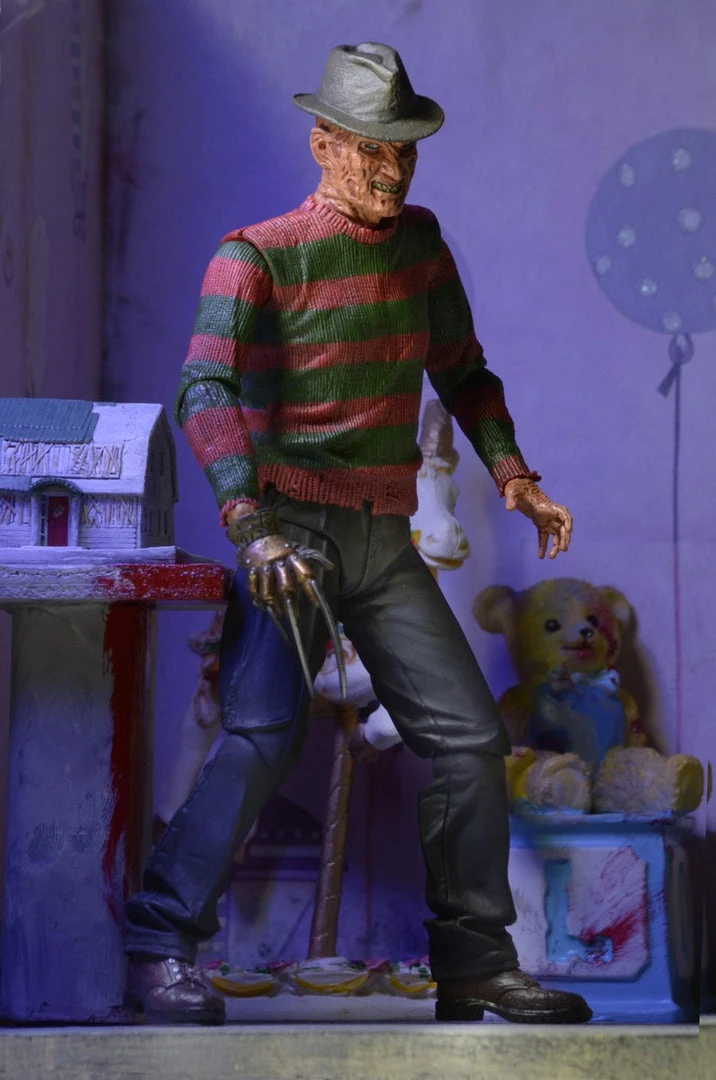 Ultimate Part 3 Freddy features plenty of gruesome detail and tons of accessories, including 2 interchangeable heads, 2 pairs of hands, the Elm Street house, Freddy puppet and removable hat. He’s fully poseable and truly terrifying – swap out his regular sweater front to display the tortured spirits trapped in his Chest of Souls!