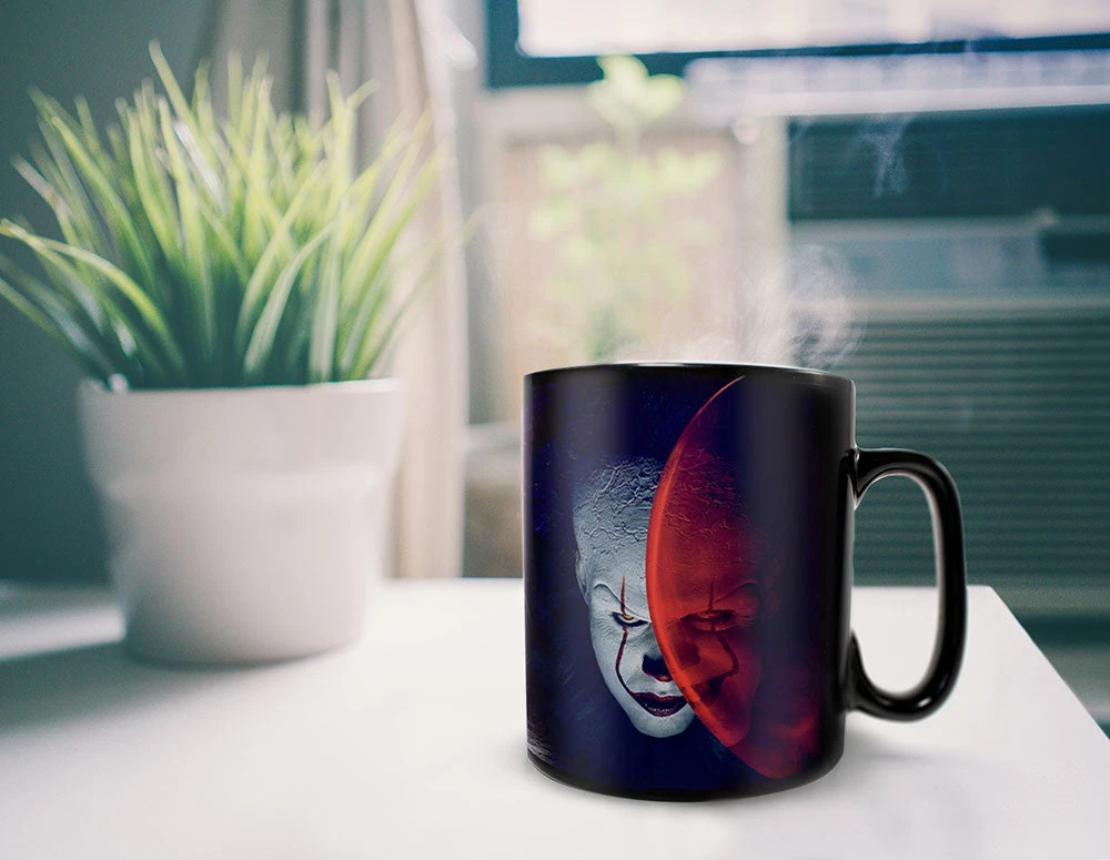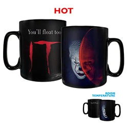 Hiya Georgie! Add your favorite hot liquid to this Morphing Mugs® Heat-Sensitive Clue Mug to watch Pennywise fully come to life, complete with his red balloon. Just remember, be careful, or “You’ll float too.”